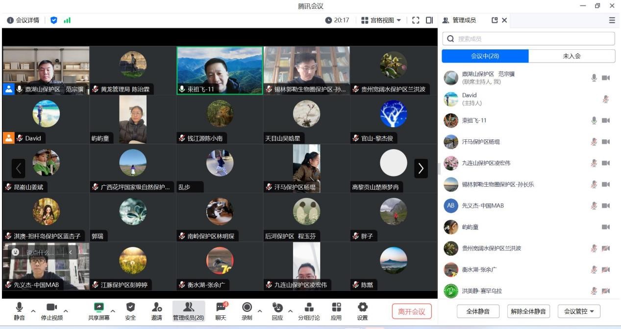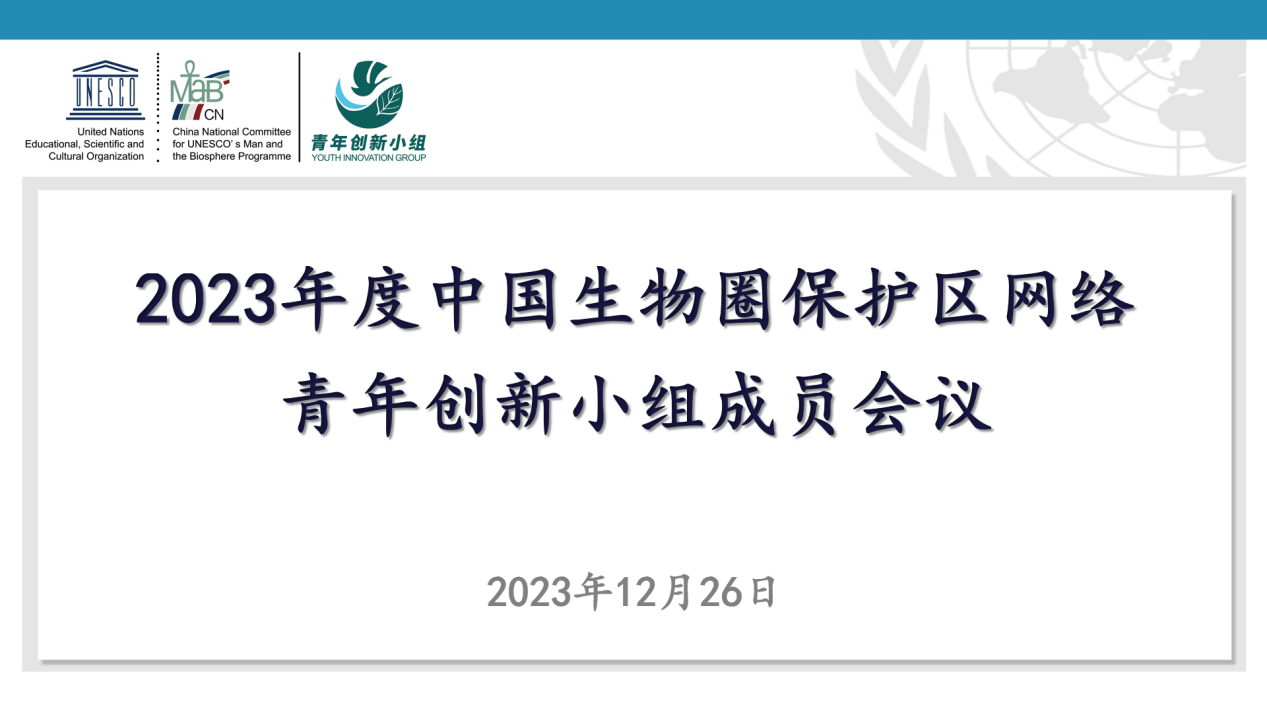 2023年12月26日,中国生物圈保护区网络青年创新小组以视频会议的方式召开了2023年成员会议,会议由组长、广东车八岭国家级自然保护区管理局局长束祖飞同志主持,青年创新小组正式成员和观察员参加了会议,中国人与生物圈国家委员会秘书处办公室领导出席并指导。