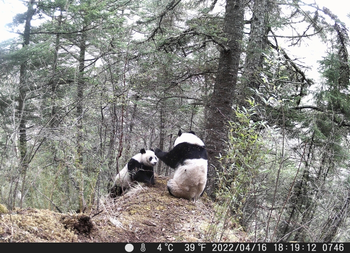 野生大熊猫平时以独居为主,每天活动范围有限。到了每年一度的发情季节,它们会更加频繁地活动和聚集,并寻找较平缓的区域作为求偶场。为了打败竞争者,雄性个体表现出丰富多样的打斗技巧,并发出高亢的吼叫声。经过持时约15分钟的竞争,胜利者多次向雌性个体发起交配行为,二者相伴的时间超过5小时,此间无其他雄性个体靠近。据预计,该头雌性个体将于今年年底产下其2018年有记录以来的第三只幼崽。
