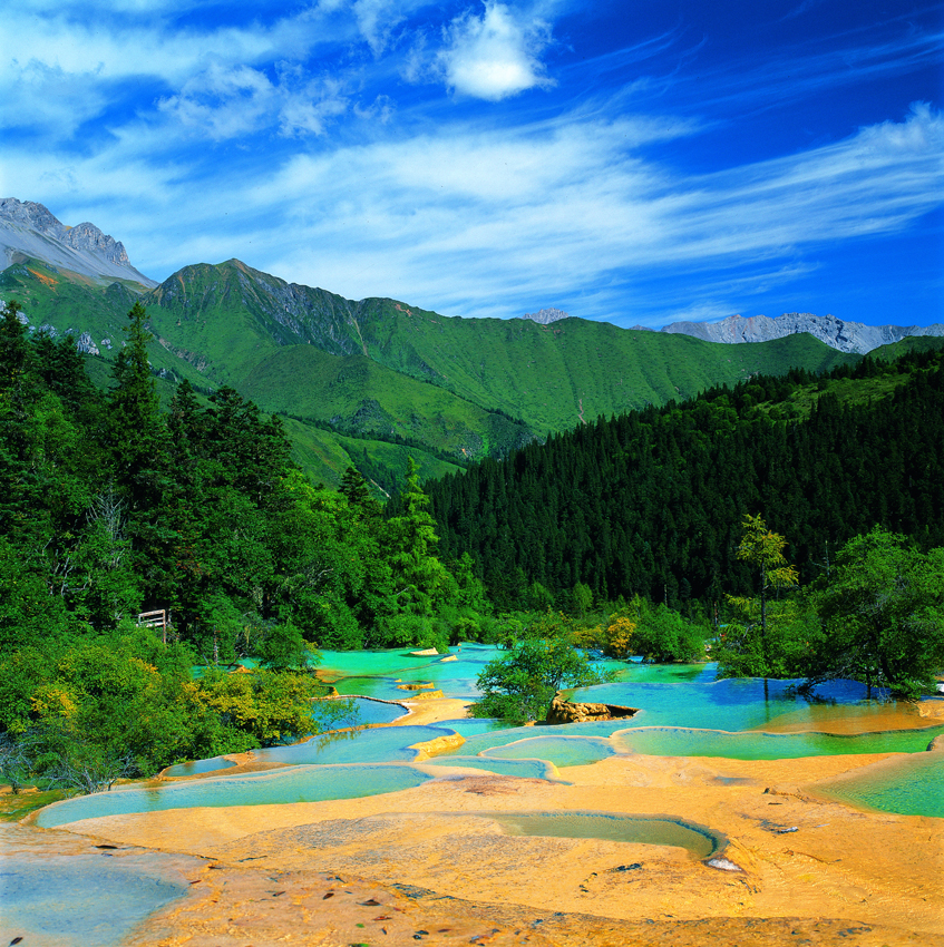 世界自然遗产地,约3400个钙华水塘构成的系统(相互之间以钙华浅滩、急流和瀑布相连),每年的牟尼沟卓锦节。