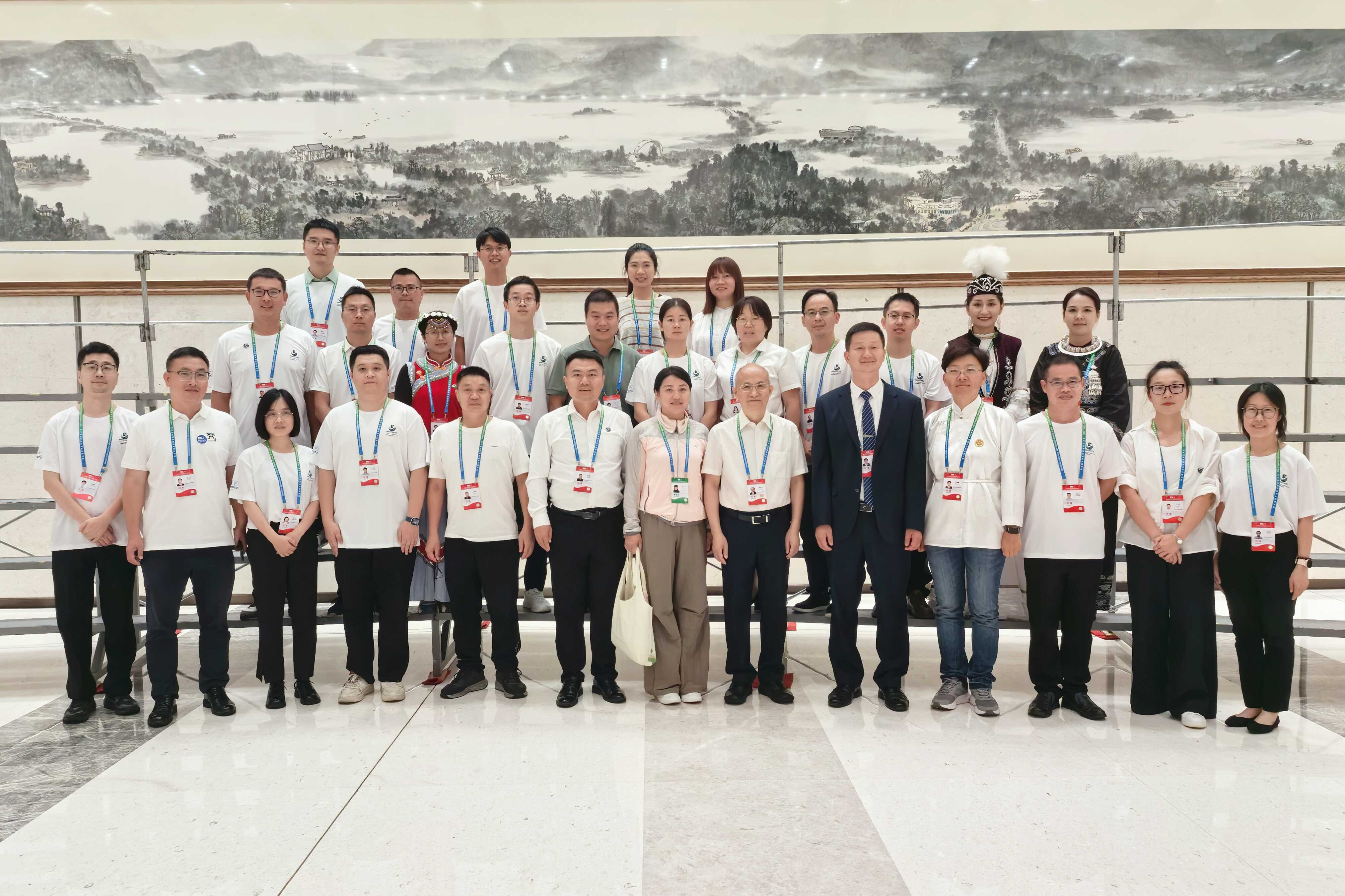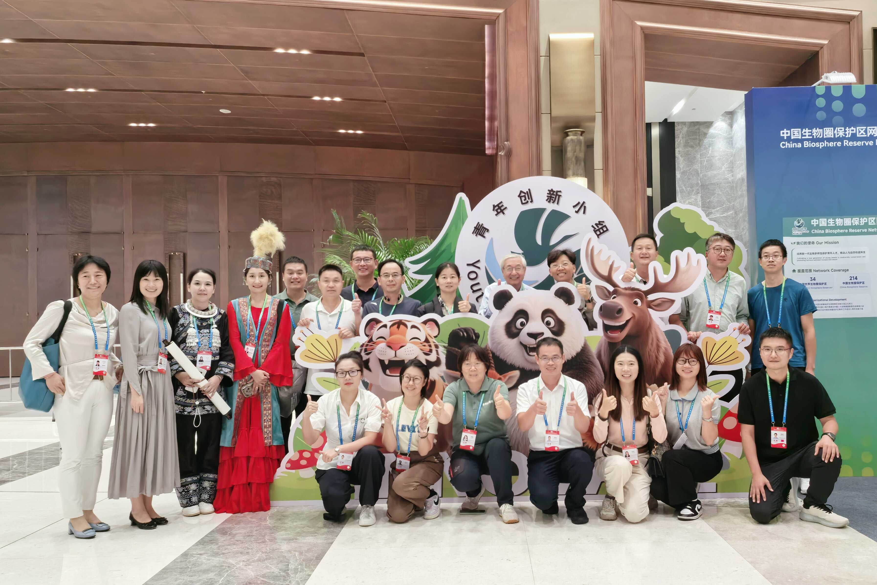 2025年第五届世界生物圈保护区大会在杭州召开期间,青年创新小组成员与中国人与生物圈国家委员会专家咨询委员会主席许智宏院士(后排右五)在大会展区的青年小组专区合影